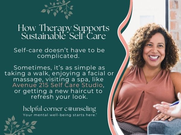 When therapy and self-care work together, everyday moments take on deeper meaning. A walk becomes grounding. A facial or massage helps calm the nervous system. A spa visit creates space to slow down with intention. Even something as simple as a fresh haircut can boost confidence—while therapy helps build the self-worth that allows that confidence to last.